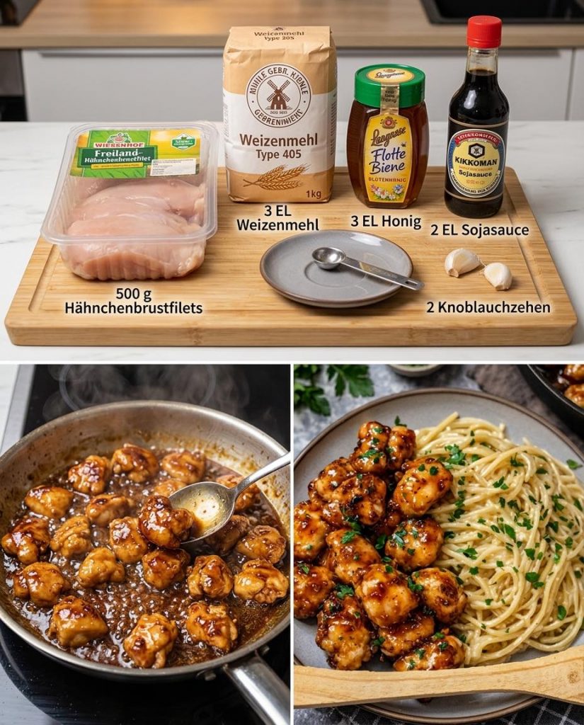 Die cremigen Spaghetti auf Tellern anrichten, das glasierte Hähnchen darüber geben und mit frischer Petersilie garnieren. Sofort heiß genießen – ein echtes Wohlfühlessen!