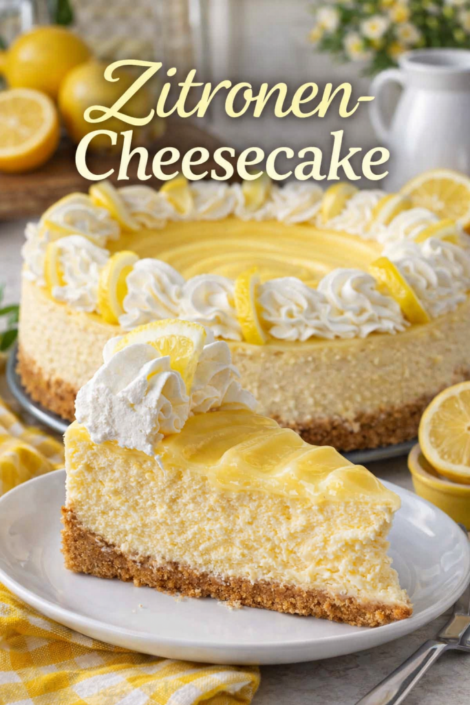 Den Cheesecake vorsichtig aus der Form lösen. Die Oberfläche mit Lemon Curd bestreichen und mit Sahnetuffs verzieren. Nach Belieben mit frischen Zitronenscheiben garnieren.