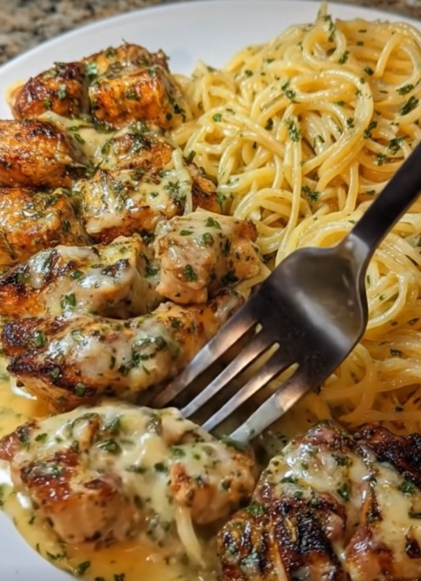 Knoblauch-Parmesan-Hähnchen-Spaghetti mit cremigem Mozzarella