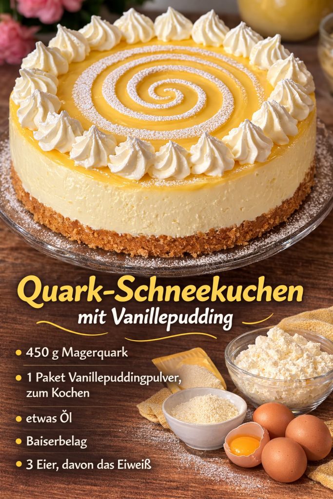 3. Als letztes 3 Eiweiß mit 40 g Zucker steif schlagen, Baiserhaube auf den Kuchen geben und weitere 10 Minuten backen.
