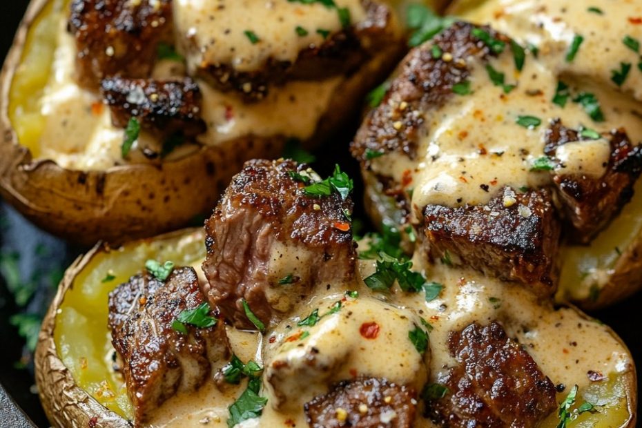 Steak-gefüllte Ofenkartoffeln mit cremiger Parmesan-Sauce