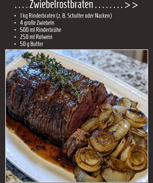 Zutaten: – 1 kg Rinderbraten (z. B. Schulter oder Nacken) – 4 große Zwiebeln – 500 ml Rinderbrühe – 250 ml Rotwein – 50 g Butter… Read More »Omas Zwiebelrostbraten = traditionell, zart und einfach himmlisch