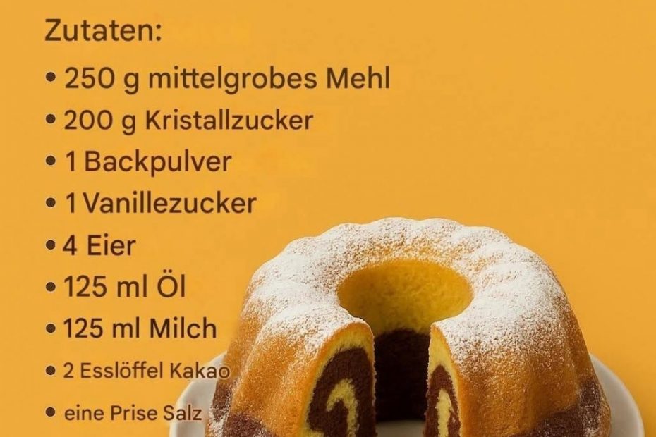 Zutaten 250 g mittelgrobes Mehl 200 g Grießzucker 1 Backpulver 1 Vanillezucker 4 Eier 125 ml Öl 125 ml Milch 2 Esslöffel Kakao eine Prise… Read More »Fluffiger Marmorkuchen